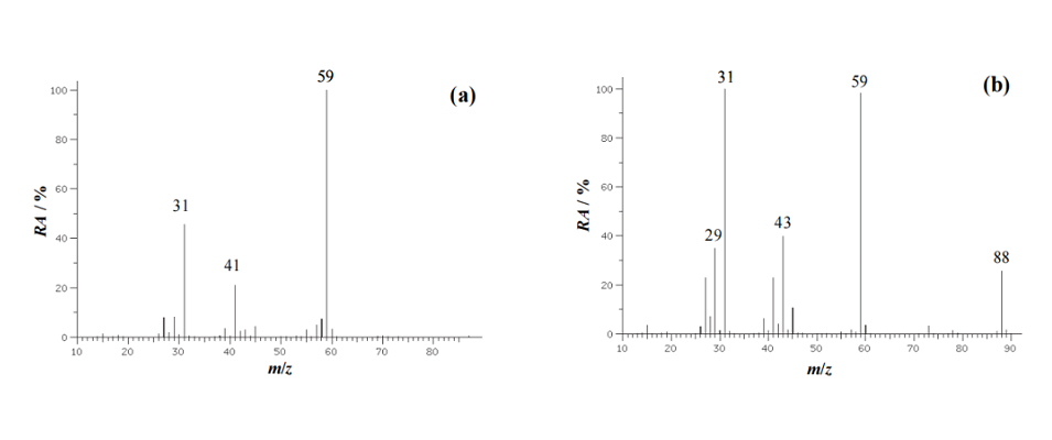 图 1(a)和 1(b)的基峰 m/z 59 是偶电子离子峰、由简单断裂失去一个乙基产生的氧鎓正离子,m/z 31 是氧鎓离子经四元环重排脱乙烯分子产生。