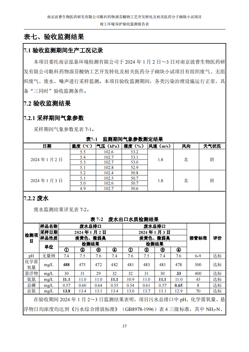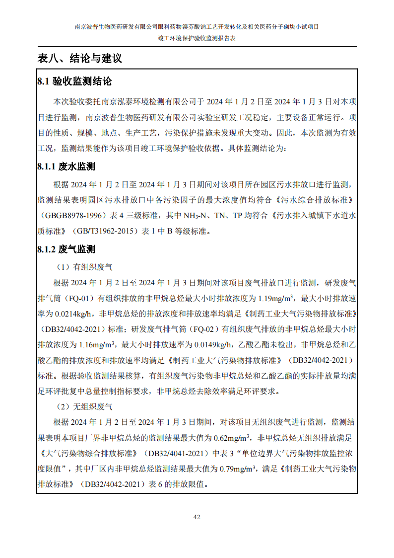 《南京波普生物医药研发有限公司眼科药物溴芬酸钠工艺开发转化及相关医药分子砌块小试项目竣工环境保护验收监测报告》见附件。
