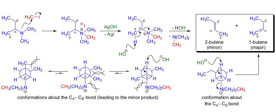 三甲基1,2-二苯基丙铵的苏式和赤式异构体在甲醇钠作用下的消除反应分别专一性的得到反式消除产物,即Z-式或E-式烯烃,说明反应经历E2消除机理。然而,当以用叔丁醇钾为碱时,只生成热力学稳定的E-式烯烃,说明此时反应经历E1cb机理。SN2取代反应是Hofmann副反应。