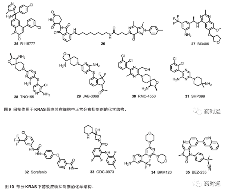 KRAS在胞内信号传递通路中处于关键位置,通过阻断 KRAS上、下游信号转导,可开发出多种间接抑制KRAS的小分子化合物。主要包括:影响KRAS 在细胞中正常分布小分子抑制剂,抑制KRAS 释放 GDP 的 SOS1 抑制剂,抑制 KRAS 脱磷酸化的 SHP2 抑制剂和抑制KRAS调控的下游信号通路的抑制剂等。