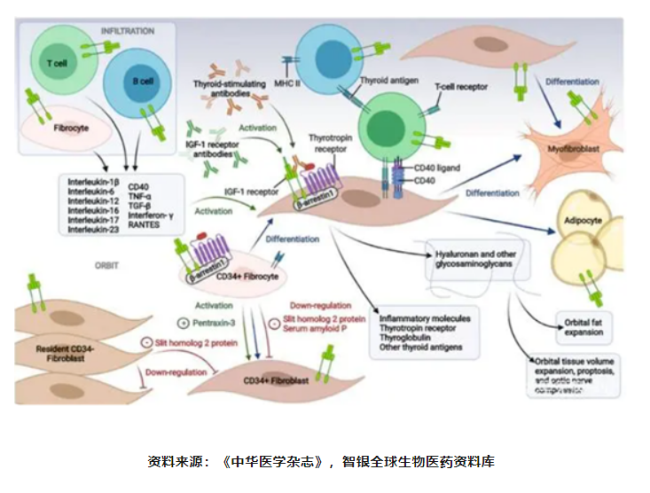 如前所述,甲状腺相关眼病(thyroidassociatedophthalmopathy,TAO)、甲状腺眼病(TED),是弥漫性毒性甲状腺肿,即Graves病(GD)常见的甲状腺外临床表现,是由甲状腺上皮细胞、眼眶周围脂肪细胞及成纤维细胞表达的自身抗原引发的特异性自身免疫疾病,主要表现为眼球突出、复视、斜视、眼眶疼痛、眼睑肿胀、眼睑退缩、眼睑闭合不全等症状,严重影响容貌并可导致视力受损。甲状腺功能低下病人和甲状腺功能正常人也可发生此病。TAO的发生率占GD患者的25%~50%,在中国未列为罕见病,患病率约0.1%~0.3%,女性发病率远高于男性。此病按照疾病进展分为活动期和静止期,多年来缺乏安全有效的药物。