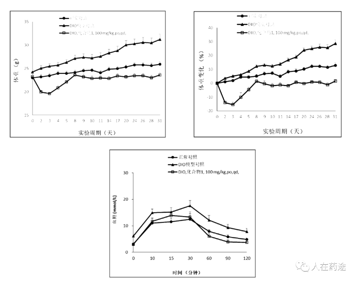 接着是Cpd.2与Cpd.4。50 mpk, po, qd给药前各组动物体重持续上涨,DIO小鼠增长幅度明显大于正常饮食小鼠,在第63天开始给药,给药的第一周两给药组动物体重快速下降达到给药前的12%-16%,第二周开始动物体重趋于稳定并一直维持;化合物2和化合物4长期给药能抑制DIO小鼠的空腹血糖升高,Cpd.2和Cpd.4长期给药能增强对葡萄糖的代谢。且Cpd.2略优于Cpd.4。