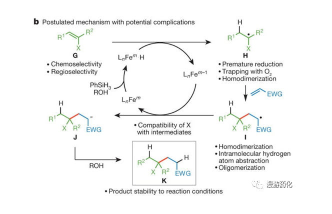 在以前实验基础上,作者使用图2a中所示的模型系统,其中甲硅烷基烯醇醚1作为供体,环己烯酮(2)作为受体,以形成官能化的烯烃交叉偶联。的类似于先前开发的,采用的Fe(ACAC)这些条件应用3(4,ACAC,乙酰丙酮)作为催化剂和PhSiH 3作为化学计量的还原剂。所形成的还原性偶联产物3基于使用内标的GC / MS(气相色谱/质谱),产率为53%。从模型系统中的副产物和有关反应的分析导致的副产物14 – 17产生(图2b)。化合物16和17可能来自Fe(acac)3表现为路易斯酸的性质,作者希望通过增加Fe中心的空间屏蔽量来减弱催化剂的路易斯酸度。尽管尝试用缺电子(10和11)和富电子(12和13)取代基改变配体的电子结构消除了反应性,但添加物Na2HPO4使所需产物3的产率从69%增加当使用Fe(dibm)3作为催化剂时,达到78%。使用约45种其他无机和胺碱作为添加剂不会导致产率增加,表明Na2HPO4不仅仅是作为缓冲剂。另外,Fe(dibm)3能够与不与Fe(acac)3反应的供体形成产物(18,图2c),其反而提供了大量的副产物16和17。在该实验的过程中,作者发现Fe(dibm)3在供体烯烃上的杂原子取代物含有路易斯碱性孤对子时提供最高产率,而Fe(acac)3在没有这种部分的情况下证明是优异的。